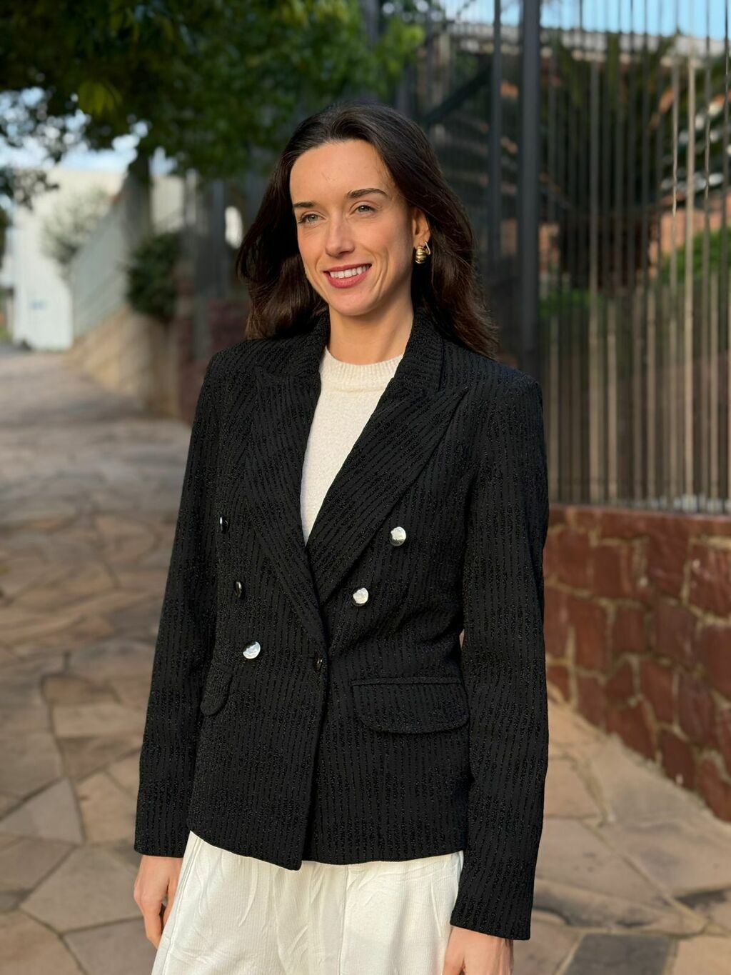 Esse blazer alongado é o clássico que vai complementar o guarda roupa de qualquer mulher. Além de lindo, é feito em tecido de alfaialtaria, super elegante. Esse blazer alongado tem gola com curvas, fechamento duplo por botões e bolsos com lapelas. Possui manga longa e tem silhueta acinturada.
